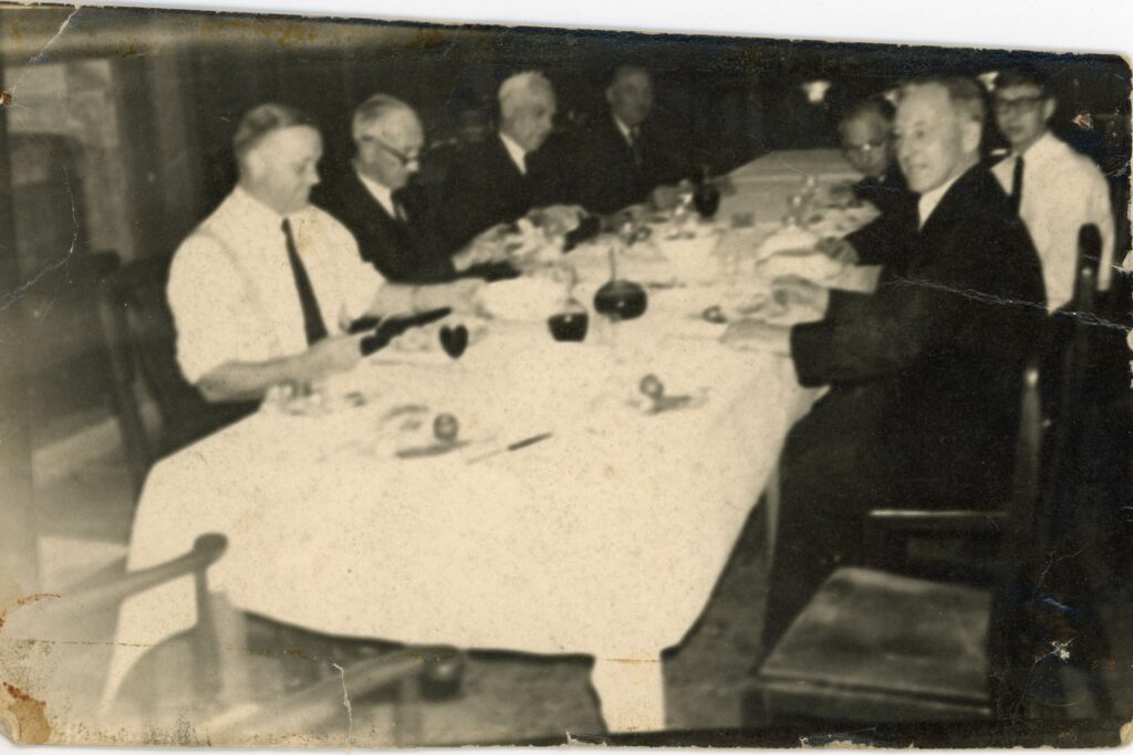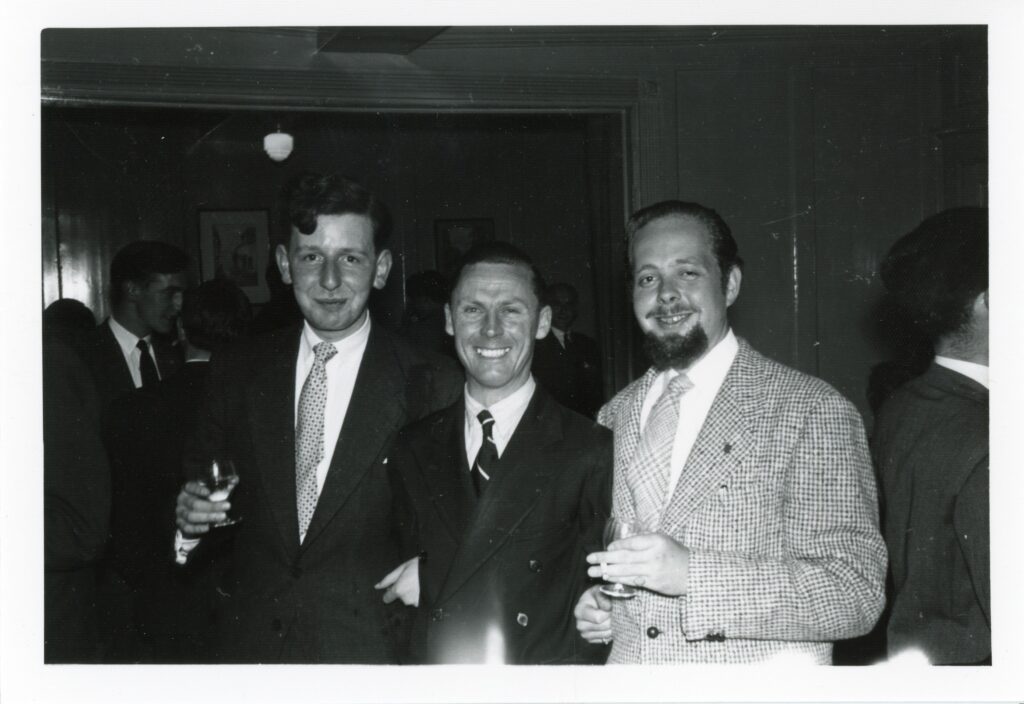 On occasion, Magdalen staff might mingle with the students at social events. The first of these two photographs shows the college scout, Liddiard (centre), attending a student party in 1954; the second shows staff at a JCR wine outing.