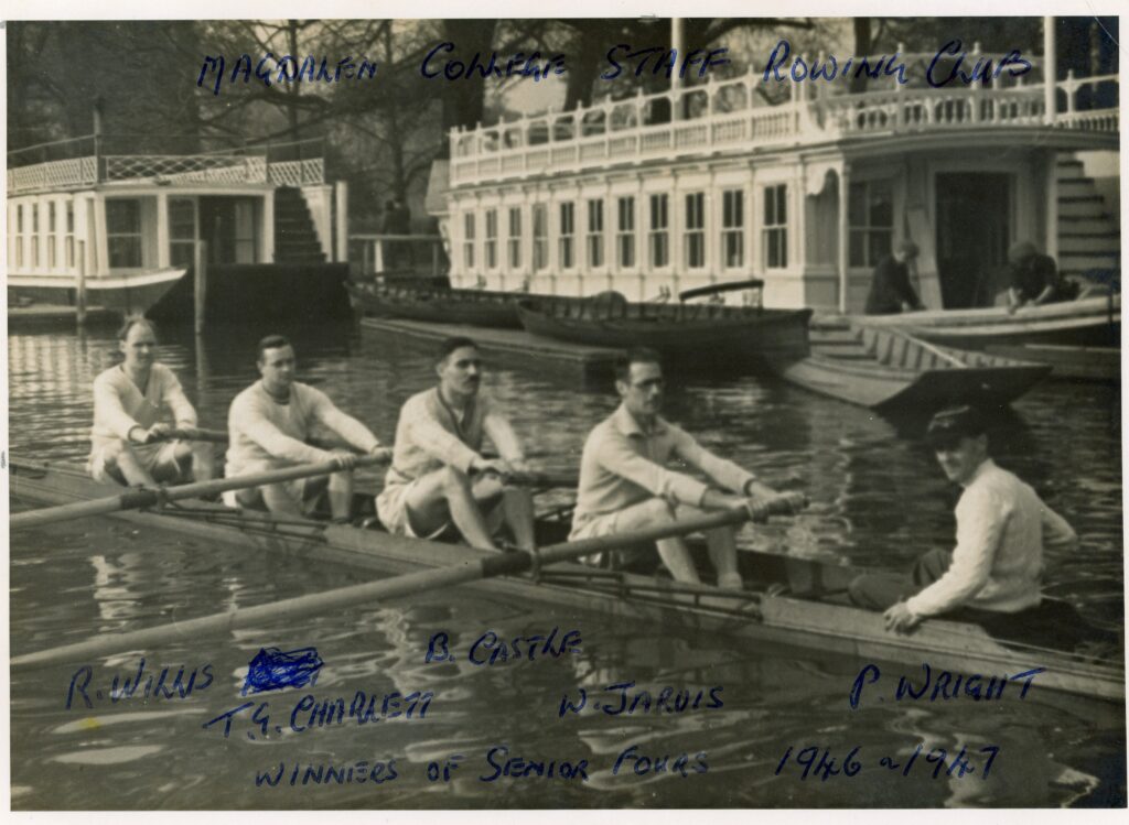 This photo shows members of the Magdalen College Fire Brigade. Founded at some point before 1925, it was formed exclusively of college staff. Among them is Tom Charlett, former Head Scout, and Frank Harvey, who later lost his life in service during World War II. College fire brigades would often compete with one another, including for a rowing ‘Challenge Cup’.