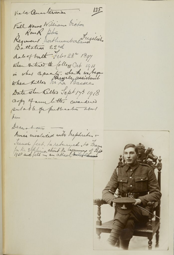 This entry relates to William Victor Quarterman, who joined Magdalen as a Bicycle Assistant in October 1911 at the age of 14. He continued in that job until, ‘being desirous of doing his duty and inspired by the earlier example of his four elder brothers’, he attested under the Derby Scheme in autumn 1915 and was called up on 1 August 1916. Quarterman is pictured to the right wearing the cap-badge and lanyard of a Gunner in the Royal Artillery, although he was later transferred to the Northumberland Fusiliers. He was killed in fighting on the southern side of the Canal d’Aire near Cuinchy, France, on 17 September 1918.
