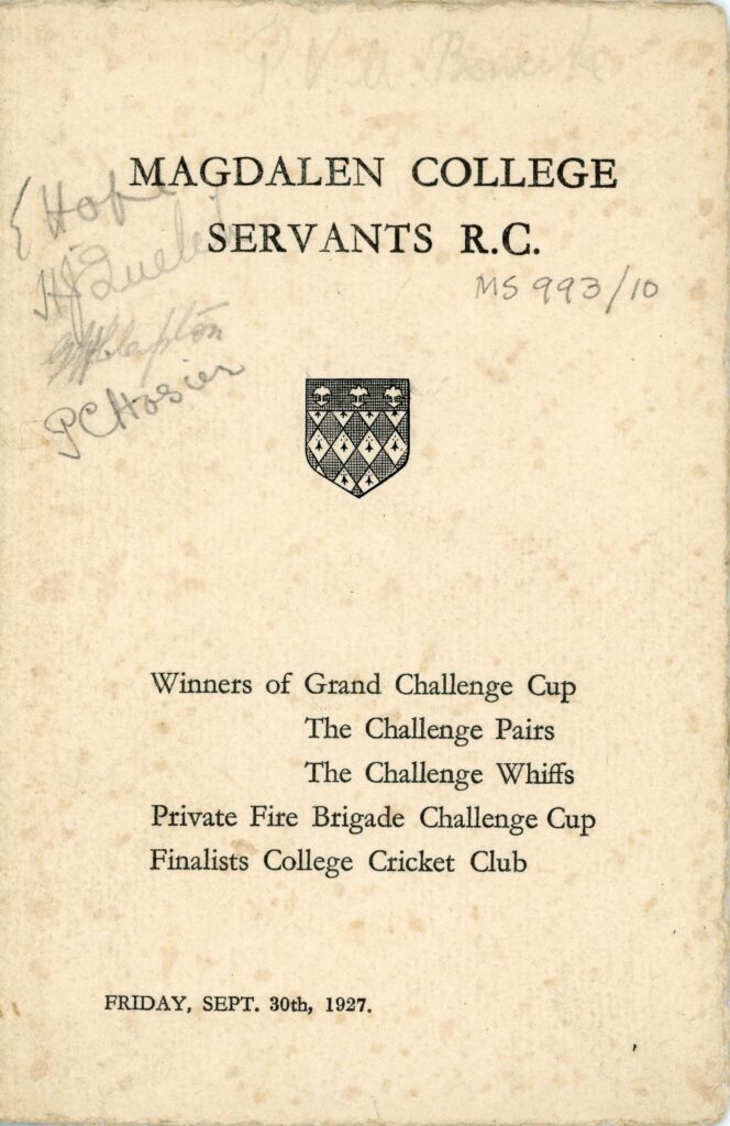 As among the students, team sports were a popular pastime among the staff. Chief among these were rowing and cricket, with Magdalen staff members taking to the river as part of the Oxford University and College Servants’ Rowing Club or picking up a bat and ball for the Magdalen College Servants’ Cricket Club. For the less energetic, they might play (and beat) the students at indoor games like shove ha’penny.