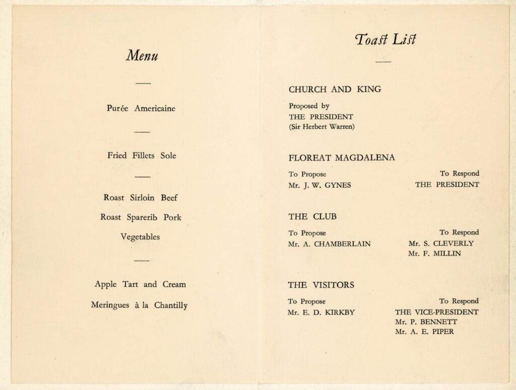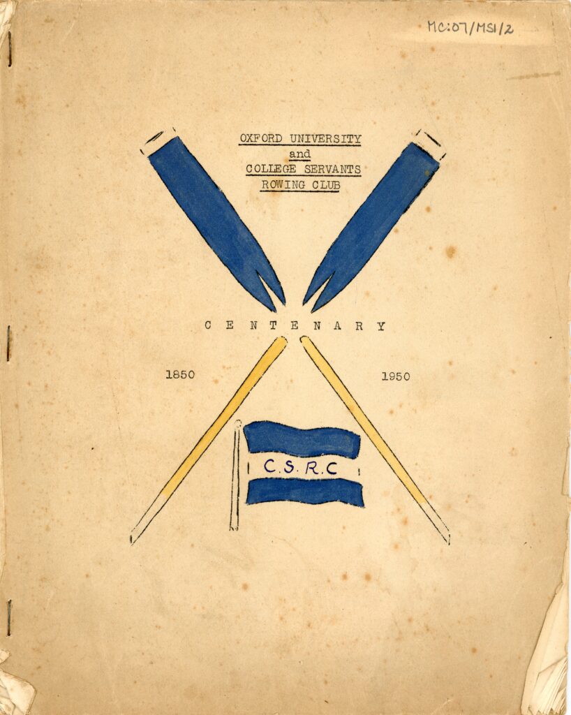 Founded in 1850, the Oxford University and College Servants’ Rowing Club was formed of different college crews. Like its student counterpart, the OUCSRC competed against its Cambridge rival. It also hosted an annual Easter Regatta. Successful crews would be fêted for their success, as the signed menu card above demonstrates. Also shown here is a typescript history marking the club’s centenary.