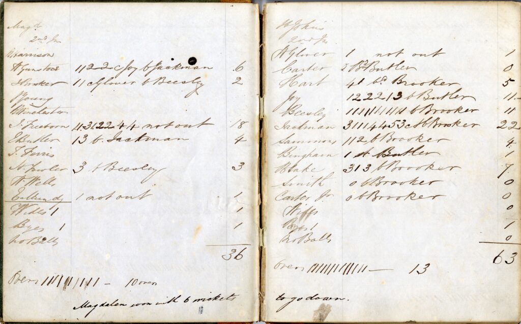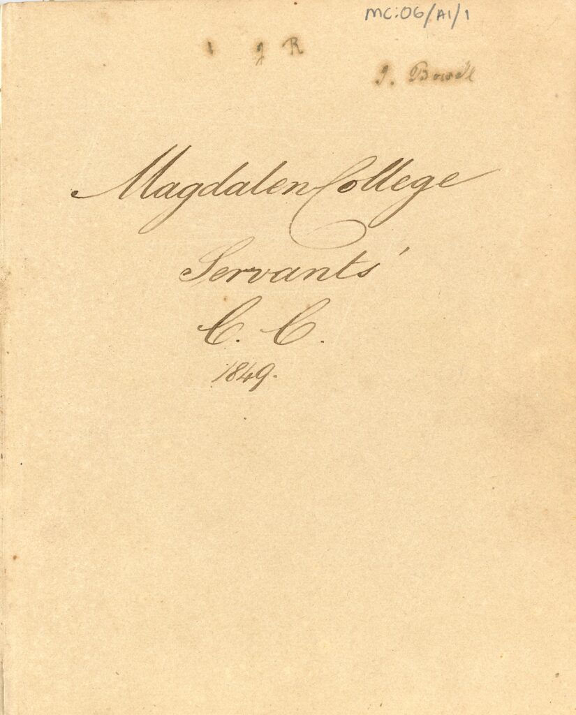 The Magdalen College Servants’ Cricket Club was founded before 1849. This scorebook contains its first recorded match (a victory over St John’s College). Servant sports teams were incredibly popular in Victorian Oxford, enduring through to the 1950s. The MCSCC played other college servants’ teams, as well as undergraduate and village sides.