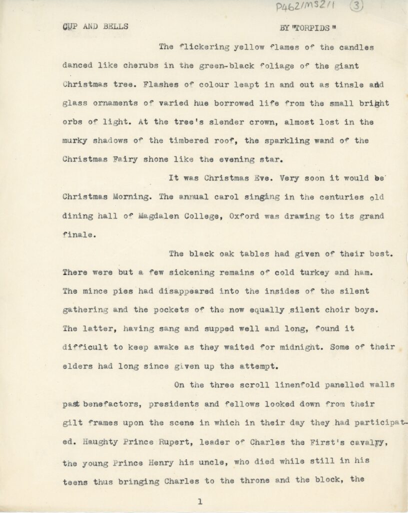 The extract above is from a short story entitled ‘Cup and Bells’, which Richardson submitted under the fittingly Oxonian pseudonym ‘Torpids’ to a competition run by The Observer. Inspired by Magdalen’s annual Christmas Eve carol service, it is a comic mystery concerning the misplacement of the college’s Founder’s Cup. By the end of ‘Cup and Bells’, Richardson reveals to his readers that a sinister theft has not taken place. Instead, the treasured Founder’s Cup has been intentionally mislaid in a juvenile prank organised by the daughter of Magdalen’s Dean and her lover, a Rhodes scholar.