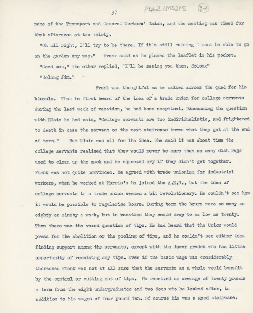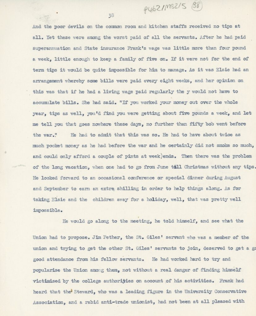 In this extract, Frank Harper mulls over whether he should attend a meeting organised by Pether. The pros and cons Harper weighs, along with the working conditions he describes, almost certainly reflect the realities faced by servants like Horace Richardson. One assumes that the character of the college’s Steward – ‘a rabid anti-trade unionist’ – was inspired by someone Richardson knew at Magdalen.