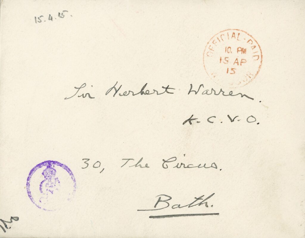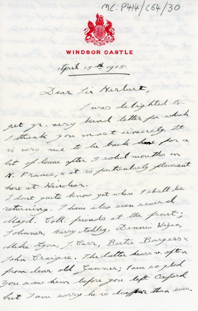 In this letter, dated 15 April 1915, the future Edward VIII, himself a former Magdalen student, writes to President Herbert Warren. He recounts his own recent visit to the front, during which he saw many Magdalen men. These included John Craigie (1910), whom the prince reports was hearing regularly from ‘old Gunner’, namely Richard Gunstone, the former JCR Steward.